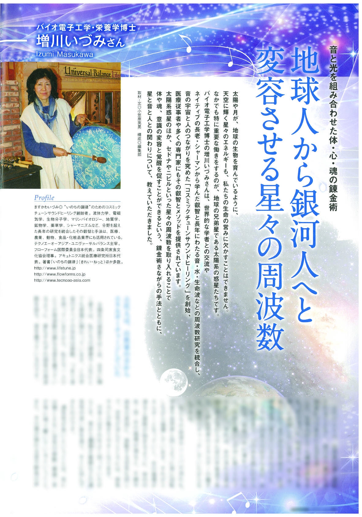 コスミックチューンサウンドヒーリング創始者の増川いづみ博士の書籍や連載、雑誌のインタビュー記事などをはじめ、各種セミナーやスクールでの講義や実習中の指導内容からまとめられました。 増川博士の説く、いのちの調律のための日常生活の整え方からサウンドヒーリングの基本的な知識、そして音叉やサウンドツールの基本的な使い方などをご紹介。 スクールの生徒の皆さまには副読本としてもおすすめいたします。